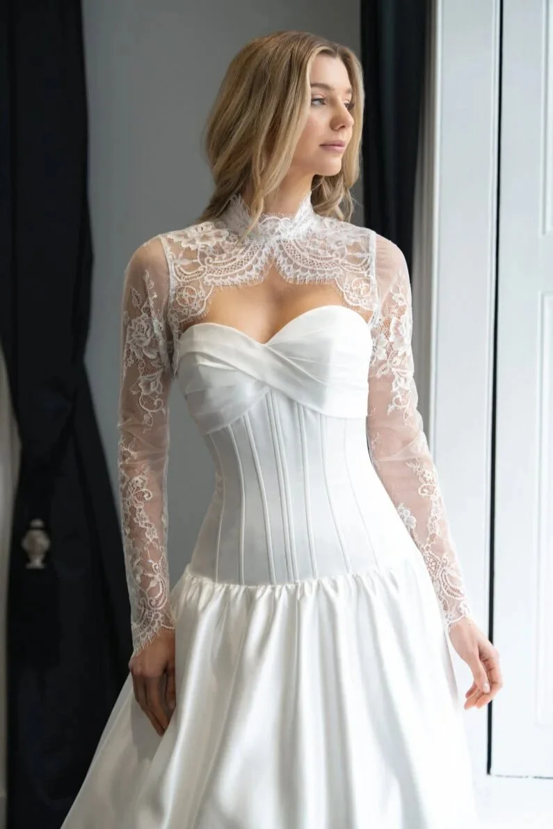 Exquisite chantilly lace, long sleeve jacket with soft collar, fully buttoned back and eyelash fringe that delicately sits over the hands. Ultra feminine and can be worn over any chantilly lace dress or plain strapless dress. £275