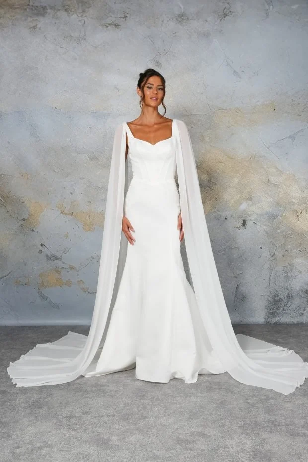 Float down the aisle in our Tali chiffon cape, made from luxurious chiffon which flows so beautifully. The front has been tapered to shape allowing your dress to still be visible, the back has a long flowing train and keyhole detail at the neckline, making it easy to change up your bridal look. Available to order in UK Sizes 4-32. Coming soon…£165